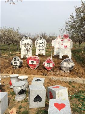 下图为配合樱花园中“休闲掼蛋区”,设计并制作的"樱花扑克牌"与"樱花石凳"(材质:扑克牌为不锈钢锻造;石凳为石材雕刻而成)